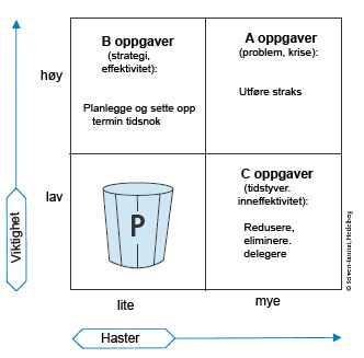 Ved hjelp av forskjellen mellom »viktig« og »haster« blir det i tid- og selvstyring definert fire oppgavetyper